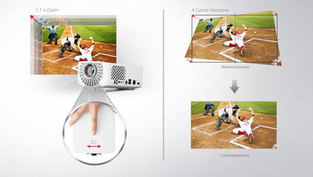 Zoom 1,1x i 4-punktowa korekcja trapezu ułatwiają montaż projektora PF1500. Pozwala to zniwelować zniekształcenia i nieprawidłowy rozmiar obrazu. |