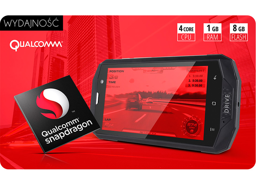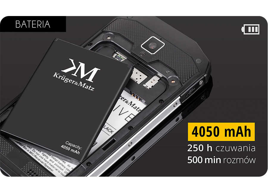 Kruger&Matz wie, jak ważna jest niezawodność i płynność pracy. Dlatego smartfon DRIVE 3 został wyposażony w czterordzeniowy procesor Snapdragon 400 doskonale znanego i cenionego w branży nowych technologii amerykańskiego producenta Qualcomm. Procesor taktowany jest zegarem 1,2 GHz oraz wspierany 1 GB pamięci RAM. Z myślą o wymagających użytkownikach, telefon pozwala na powiększenie 8 GB pamięci wewnętrznej o dodatkowe 32 GB za pomocą karty microSD.
