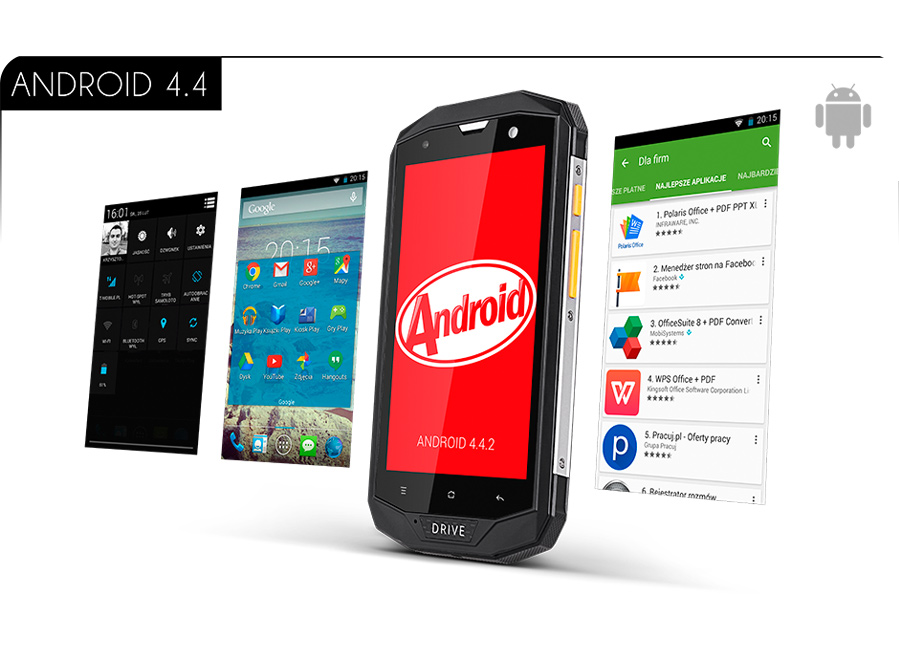 DRIVE 3 działa w oparciu o system operacyjny Android 4.4 KitKat. Dzięki temu, smartfon zapewnia intuicyjną i łatwą obsługę, a sklep Google Play umożliwia dostęp do niezliczonej ilości aplikacji, które z pewnością ułatwią Ci pracę.
