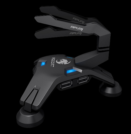 Roccat Apuri - HUB USB + Mouse Bungee to urządzenie z dziedziny SDMS (Smart Desktop Management System). Z jednej strony rozwiąże problem plątającego się kabla od myszki - daje swobodę poruszania gryzoniem, jak przy myszy bezprzewodowej - z drugiej jest praktycznym HUBem USB z czterema portami. Apuri wyposażone jest w cztery diody LED, opasające niewielkie logo Roccat. Kolejnym urozmaiceniem może byc logo wyświetlające sie na naszym biurku ponieważ pod Apuri umieszczono świecący emblemat producenta.