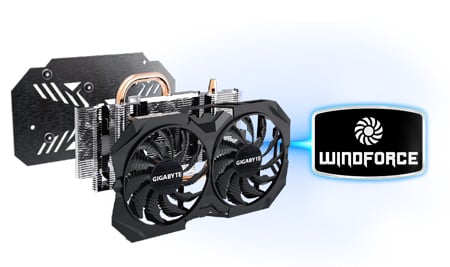 GIGABYTE przedstawia WINDFORCE, najnowszą technologię chłodzenia, która odróżnia karty GIGABYTE od reszty. Gigabyte rozumie że wydajne chłodzenie jest niezbędne do pracy najpotężniejszych kart graficznych, więc tylko najlepsze wentylatory zostały wybrane dla kart z systemem chłodzenia WINDFORCE