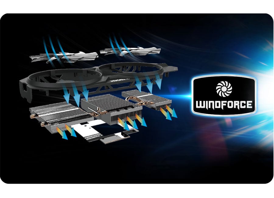 Chłodzenie WINDFORCE 2X wyposażone zostało w wysokiej jakości system heat-pipe z czystej miedzi, chłodzący bezpośrednio GPU. Zastosowane rozwiązanie, cechuje się niezwykle szybkim rozpraszaniem ciepła. Unikalny kształt łopatek wentylatorów, nie tylko przyspiesza chłodzenie ale i zmniejsza turbulencje strumienia powietrza, zmniejszając tym samym powstały hałas.