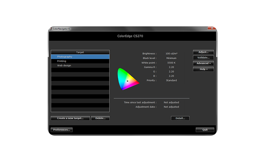 Do modelu ColorEdge CS270-BK dołączono autorskie oprogramowanie do kalibracji o nazwie ColorNavigator 6. ColorNavigator został stworzony przez EIZO, dzięki czemu jest kompatybilny z systemami operacyjnymi Mac, Windows i Linux, a także współpracuje z szeroki wyborem urządzeń do pomiarów, takich jak X-Rite czy DataColor. Dla uproszczenia pracy w programie wprowadzono predefiniowane ustawienia docelowe dla fotografii, projektowania stron i drukowania. Zaawansowani użytkownicy mogą sami wprowadzać wartości jasności, punktu bieli oraz krzywej gamma, aby tworzyć własne profile docelowe. Kalibracja zajmuje tylko kilka minut.