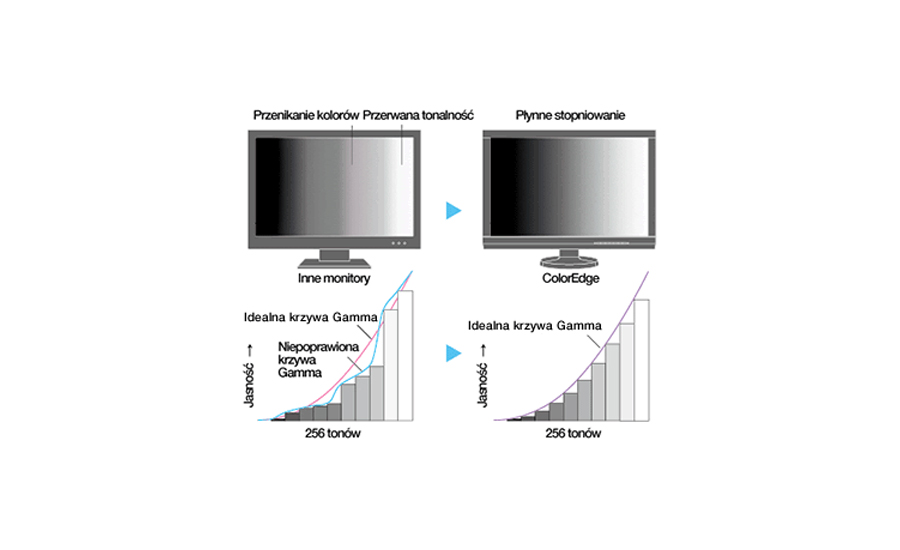 Krzywa gamma jest regulowana dla każdego monitora z serii ColorEdge z osobna w fabryce EIZO w Japonii. Robi się to mierząc wartości gamma dla każdego z kolorów podstawowych RGB (czerwony, zielony, niebieski) w skali 0–255, a następnie korzystając z 16-bitowej tabeli barw Look-Up Table (LUT) monitora, aby wybrać najbardziej pasujące 256 odcieni.