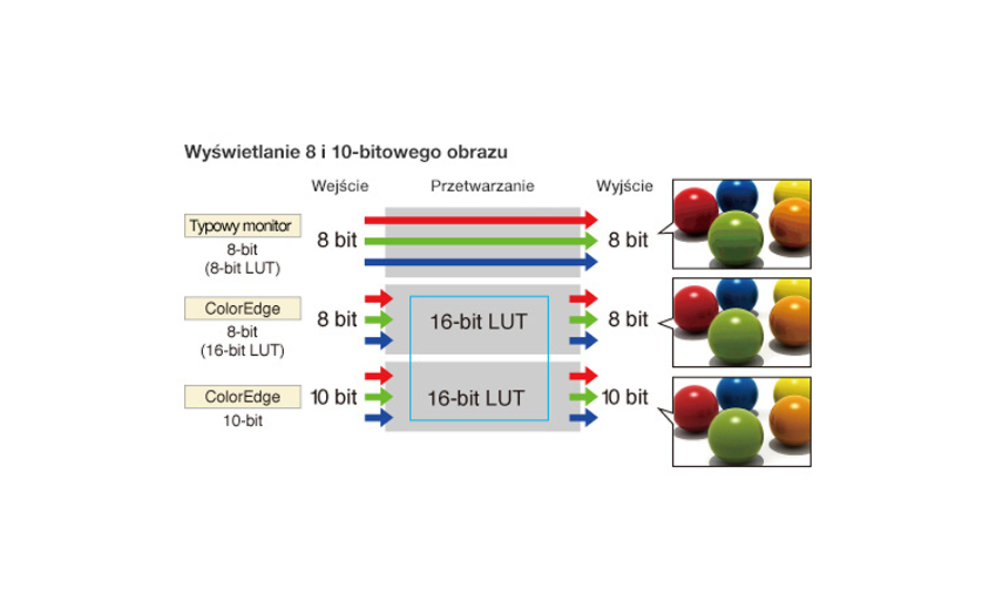 Korzystając z wejścia sygnałowego DisplayPort możliwe jest dostarczanie do CS270-BK 10-bitowej informacji o kolorze*. Dzięki 16-bitowej tablicy LUT monitor jest w stanie odtworzyć nawet miliard kolorów jednocześnie. W porównaniu z sygnałem 8-bitowym to 64 razy więcej kolorów, co zapewnia płynniejsze przejścia tonalne i zmniejszenie współczynnika Delta-E pomiędzy sąsiednimi kolorami.