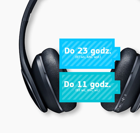 Ciesz się dłużej muzyką, bez konieczności ładowania - gdy słuchawki są połączone przez Bluetooth, mogą grać przez od 11 (z włączonym ANC) do nawet 23 godzin (z wyłączonym ANC). W przypadku połączenia przewodowego, możesz słuchać muzyki do 20 godzin, z włączonym trybem ANC. |