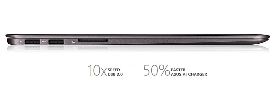 Trzy porty USB 3.0 ZenBooka UX305LA oferują nawet dziesięciokrotnie wyższe prędkości transferu danych w porównaniu z połączeniem USB 2.0, dostarczając więcej mocy dla szybszego ładowania. ZenBook UX305LA idzie jednak jeszcze dalej: technologia ASUS USB Charger+ zintegrowana w jednym z portów pozwala na ładowanie podłączonych urządzeń do 50% szybciej – nawet jeśli ZenBook jest uśpiony lub wyłączony.