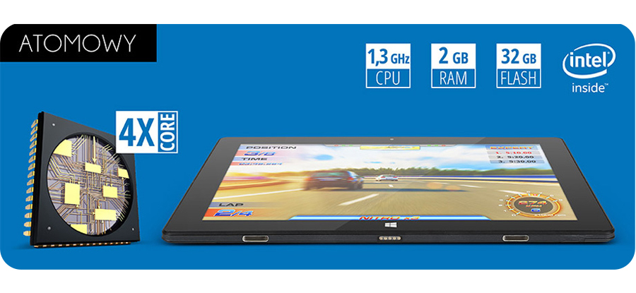 Wydajny, czterordzeniowy procesor Intel® Atom™ Z3735F o taktowaniu 1,33 GHz wspieramy 2 GB RAM-u oraz układ graficzny Intel® HD Graphics tworzą razem zgraną całość. W połączeniu z 32 GB pamięci wewnętrznej, urządzenie gwarantuje płynną i miarową pracę.