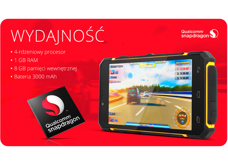 Smartfon MOVE 3 został wyposażony w jedną z nowszych wersji systemu operacyjnego Android. Dzięki temu zyskujesz bardziej intuicyjną obsługę oraz większą płynność pracy. Android daje Ci dostęp do sklepu Google Play. Wejdź i ciesz się tysiącem gier oraz aplikacji. Pancerna obudowa smartfona jest obiecującą zapowiedzią tego, co czeka Cię po włączeniu urządzenia. Wzmocniona konstrukcja współgra z solidnymi parametrami technicznymi telefonu. Drive 4 pracuje w oparciu o czterordzeniowy procesor Qualcomm Snapdragon 410 o taktowaniu maksymalnym 1,2 GHz. W celu zwiększenia komfortu pracy, producent wyposażył telefon w 1 GB RAMu oraz 8 GB pamięci wewnętrznej, z możliwością zwiększenia jej o 32 GB przy użyciu karty pamięci.