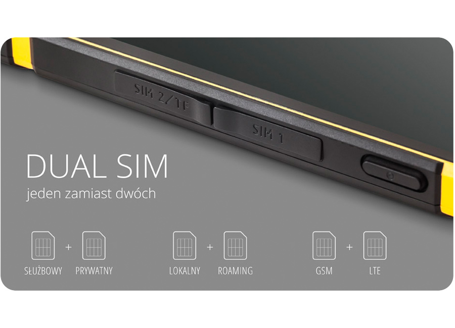 W celu maksymalizacji funkcjonalności, telefon oferuje swoim użytkownikom opcję Dual SIM. Możliwość korzystania z dwóch kart jednocześnie (micro SIM i nano SIM) z pewnością przypadnie do gustu tym, którzy posiadają dwa numery, lub korzystają z lokalnej karty podczas zagranicznych podróży. W razie potrzeby istnieje też możliwość zainstalowania karty pamięci microSD w drugim slocie SIM. Pancerny, a jednak elastyczny!