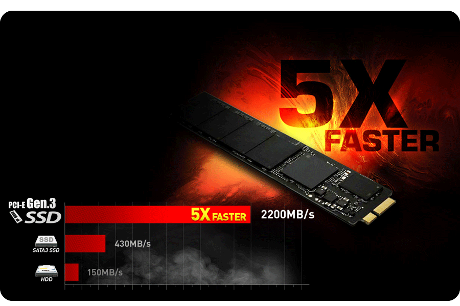 Wyprzedź innych i zdobądź najbardziej zaawansowany system pamięci dyskowej składający się z dysków SSD w 4-kanałowym interfejsie PCI-E Gen.3 z kontrolerem NVMe, zapewniający prędkość odczytu na poziomie 2200MB/s – czyli 5x szybciej niż dyski SSD w interfejsie SATA3.