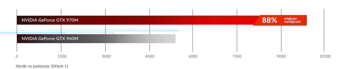 Laptop wyposażony w kartę graficzną NVIDIA GeForce GTX 970M jest o 88% bardziej wydajny w przetwarzaniu grafiki w porównaniu z NVIDIA GeForce GTX 960M.