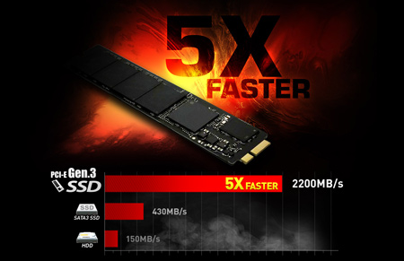 Wyprzedź innych i zdobądź najbardziej zaawansowany system pamięci dyskowej składający się z dysków SSD w 4-kanałowym interfejsie PCI-E Gen.3 z kontrolerem NVMe, zapewniający prędkość odczytu na poziomie 2200MB/s – czyli 5x szybciej niż dyski SSD w interfejsie SATA3. |