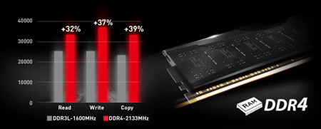 Zdobądź najlepszą wydajność swojego notebooka ze wsparciem pamięci DDR4-2133, osiagnij prędkość odczytu ponad 2,9GB/s i 3,2GB/s zapisu. Ponad 30% szybciej niż poprzednia generacja DDR3-1600, DDR4-2133 to nowy standard przenoszący doświadczenie extremalnego gamingu na wyższy poziom. |