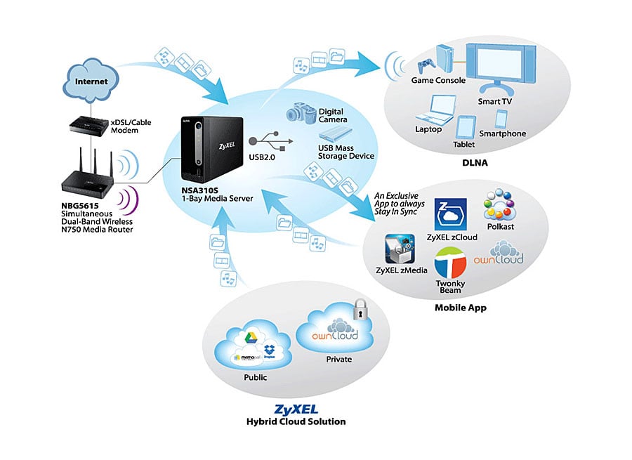 Multimedialny serwer ZyXEL jest czymś więcej niż tylko centralną domową biblioteką plików cyfrowych. Model ZyXEL NSA310S za pomocą aplikacji Polkast umożliwia łatwe i efektywne przechowywanie oraz udostępnianie twoim znajomym zdjęć w dużej rozdzielczości, muzyki i innych plików multimedialnych. Możesz zsynchronizować zdjęcia z portalu Flickr i pliki wideo z YouTube z serwerem NSA310S poprzez Polkast i przesyłać muzykę oraz zdjęcia do serwisu play-zone, a także zarządzać plikami zdalnie z poziomu urządzenia mobilnego z dowolnego miejsca.