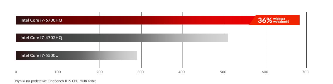 Laptop wyposażony w procesor Intel Core i7-6700HQ jest o 36% bardziej wydajny w porównaniu z Intel Core i7-5500U. Zapewnij sobie lepsze osiągi.