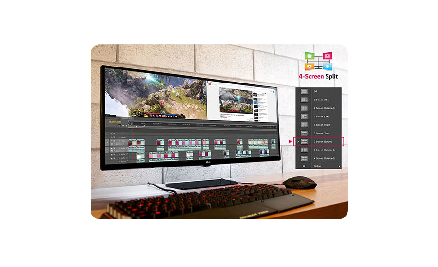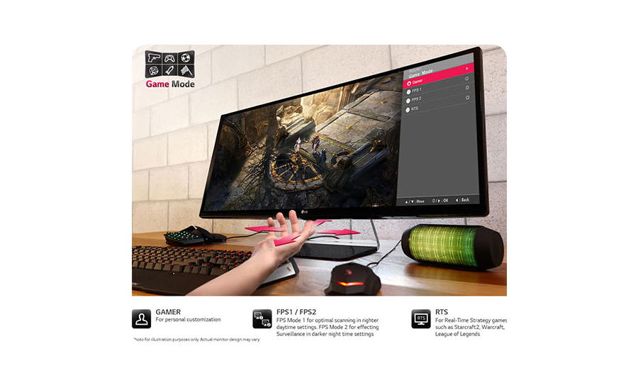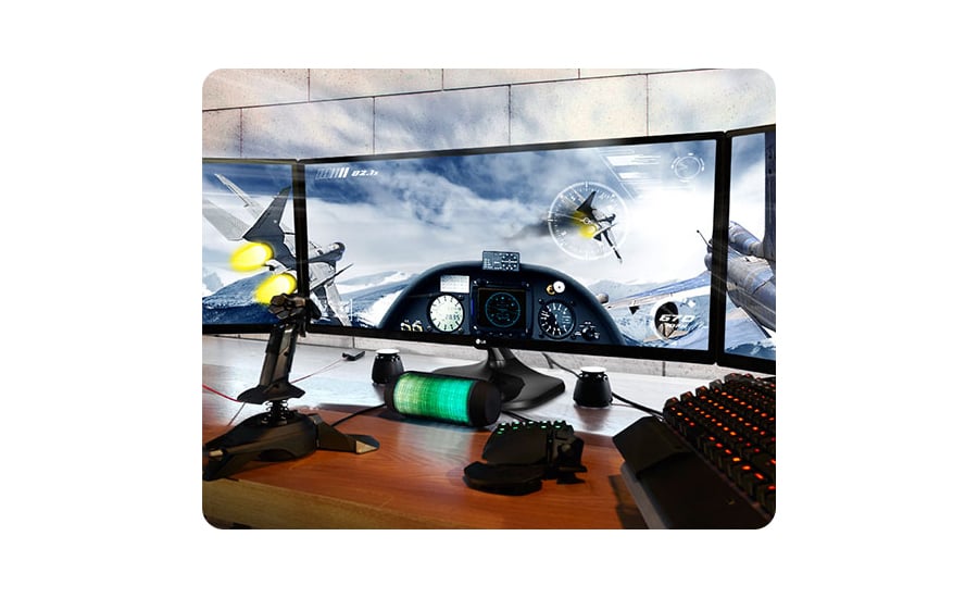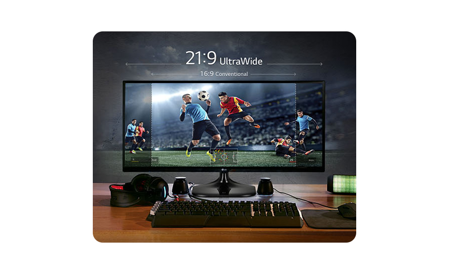 Monitor LG UltraWide udostępnia Ci panoramiczny krystaliczny obraz z perfekcyjnie odwzorowanymi kolorami. Gracze nigdy nie siedzą spokojnei w jednym miejscu - nie ma problemu, ekran LG IPS wygląda doskonale z każdego kąta. Dynamiczny Action Sync pozwala uchwycić każdy moment w czasie rzeczywistym. LG Black Stabilizer rozjaśnia ciemne sceny, dzieki czemu Twój przeciwnik nie ukryje sie w mroku.