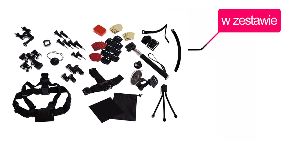 Zestaw akcesoriów zawiera: uchwyt montażowy na kierownicę, szelki na klatkę piersiową, opaskę na głowię i ramię, przyssawkę na szybę oraz przyklejane uchwyty do przymocowania kamery, a także monopad i ministatyw.