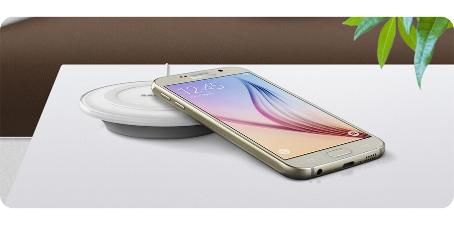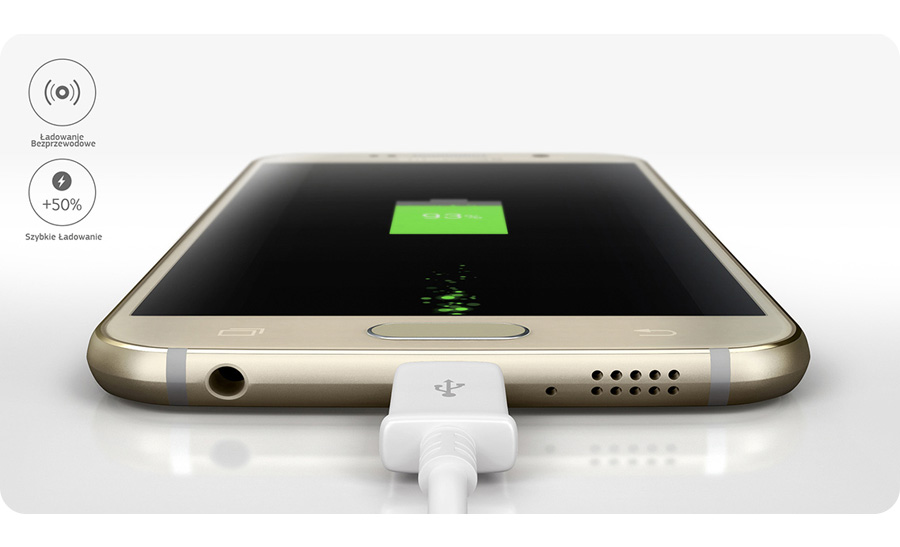 Zapomnij o rozładowanej baterii - Samsung Galaxy S6 ładuje się błyskawicznie, nawet 1,5 raza szybciej, niż poprzednie modele. Wbudowana funkcja ładowania bezprzewodowego oznacza, że możesz uwolnić się od kabli i naładować baterię na bezprzewodowych podkładkach.