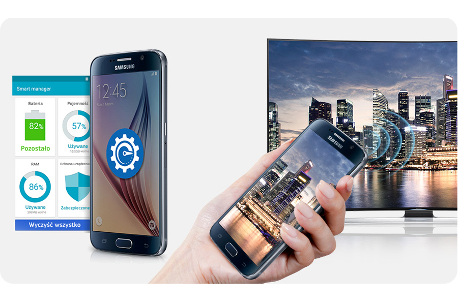 Jeden dotyk dzieli Cię od sparowania Galaxy S6 z Samsung Smart TV poprzez BLE (Energooszczędny Bluetooth). Udostępniaj ekran smartfona na telewizorze albo oglądaj programy telewizyjne na wyświetlaczu smartfona.