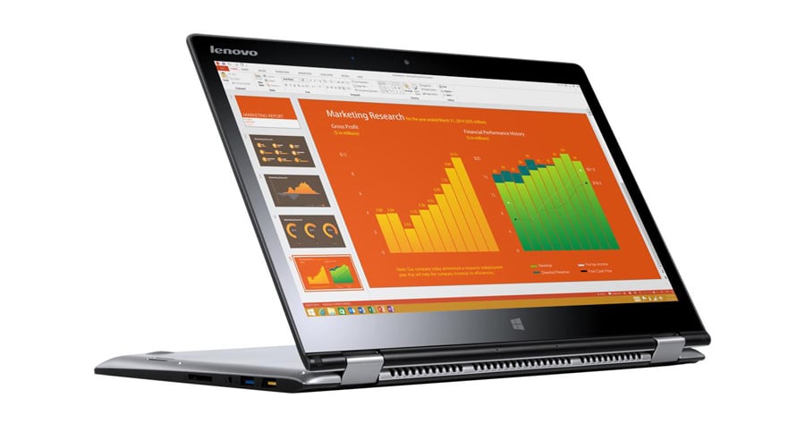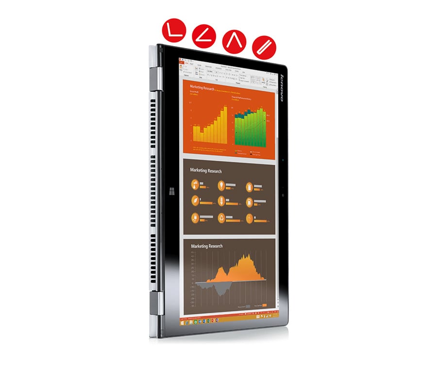 Yoga 3 to nadzwyczaj elastyczny komputer osobisty. Umożliwia korzystanie na cztery sposoby: laptop, podstawka, namiot lub tablet. Koncepcja: Dzięki unikalnemu designowi Lenovo Yoga 3 jego ekran dotykowy można obracać dookoła, tj. o 360 stopni. Lenovo Yoga 3 to laptop idealny dla osób aktywnych – waży zaledwie 1,6 kg i ma 18,3 mm grubości.