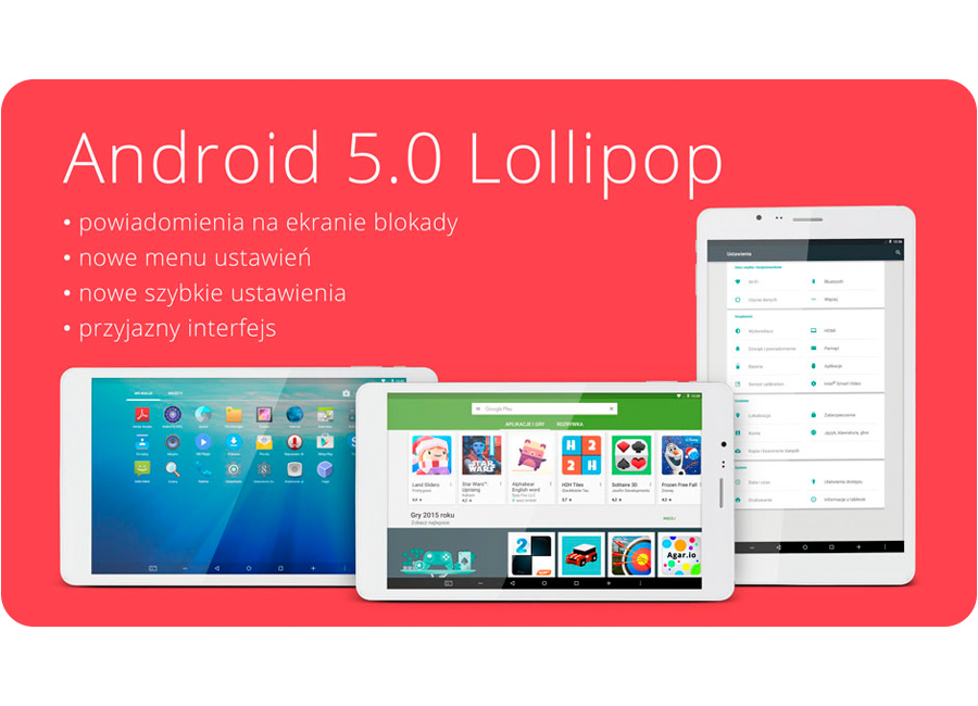 Tablet pracuje w oparciu o Lollipop - kolejną odsłonę systemu operacyjnego Android, która nie tylko wyróżnia się płynną pracą, ale prezentuje również nową, odświeżoną szatę graficzną. Nawet jeśli urządzenie na Androidzie jest dla Ciebie czymś nowym, intuicyjność obsługi przypadnie Ci do gustu. A to dopiero początek. Przekonaj się sam