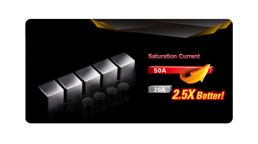 W porównaniu do tradycyjnych dławików, Premium 50A Power Chokes zastosowane w płycie ASRock zapewniają trzykrotnie lepszy prąd nasycenia procesora i jego efektywniejsze zasilanie.