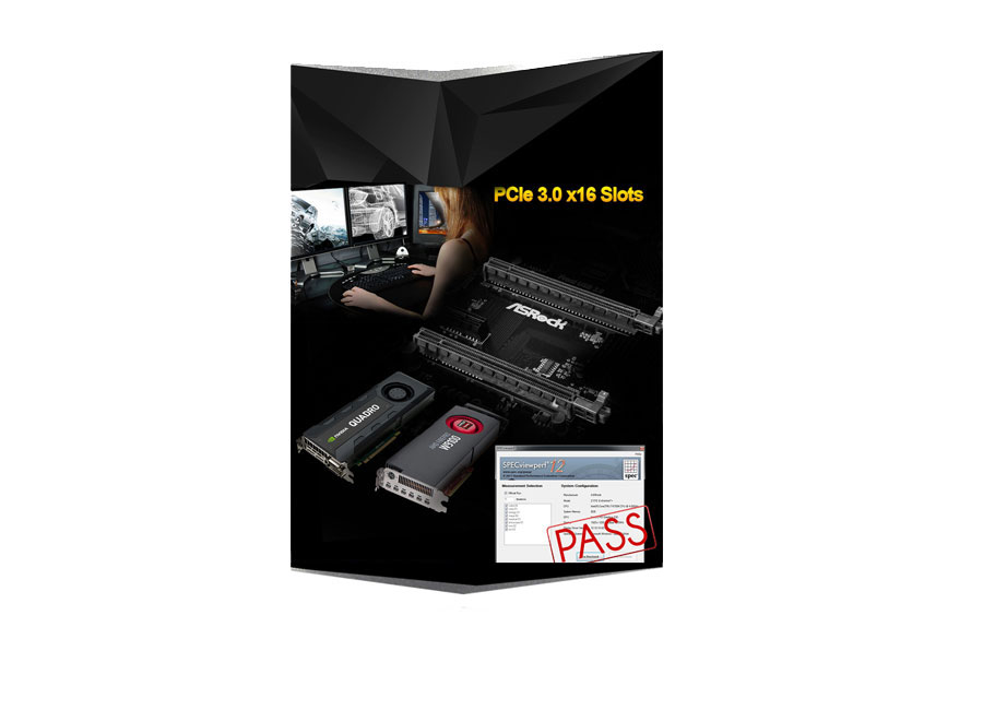 Dwa sloty PCIe Gen3 x16 obsługują nie tylko standardowe układy graficzne, ale także w pełni wspierają profesjonale karty z serii Nvidia® Quadro oraz AMD FirePro dedykowane stacjom roboczym.
