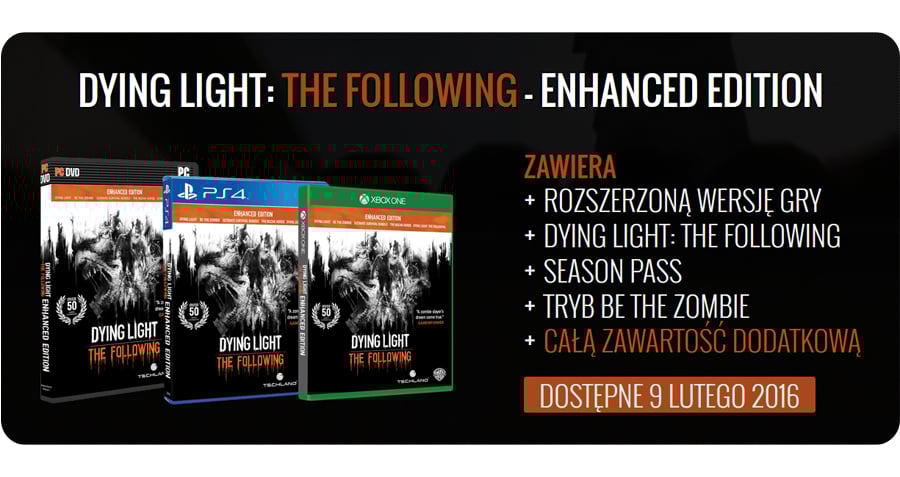 Dying Light: The Following – Enchanced Edition to najbogatsze wydanie na rynku. Zawiera nie tylko podstawową wersję gry, ale również wszystkie DLC, jakie do tej pory się pojawiły w Season Passie (Przepustka sezonowa) oraz największe jak do tej pory rozszerzenie The Following. Po ucieczce z Harran, Kyle Crane dociera do rejonów w którym władze sprawuje tajemniczy, pradawny kult. Okazuje się, że wyznawcy „Matki” są odporni na wirusa z Harran. Kyle stanie przed zagadką, której rozwiązanie może doprowadzić do unicestwienia zabójczego wirusa.