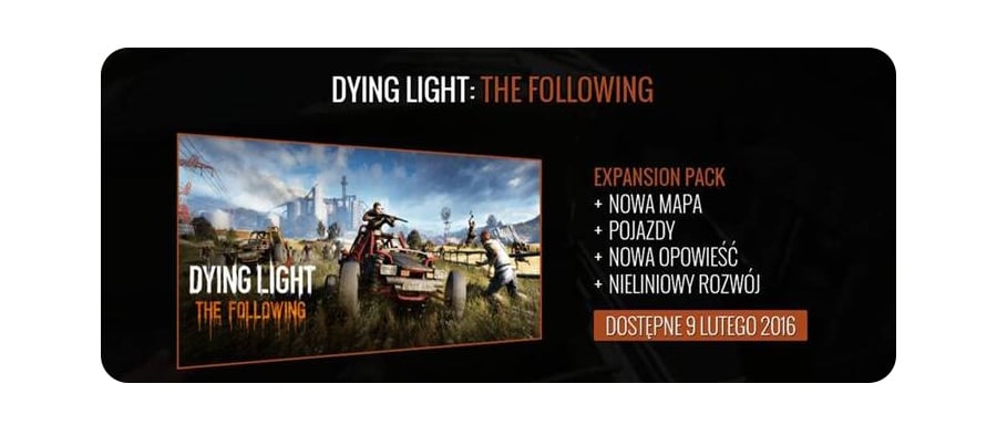 Dying Light: The Following to ogromne rozszerzenie do gry Dying Light i jednocześnie nieznany rozdział historii Kyle’a Crane’a. Odkryjesz rozległy region, który poprzez nowe lokacje, mechaniki rozgrywki i wyzwania odmieni twoje spojrzenie na Dying Light. Jednocześnie wciąż będziesz mógł korzystać ze wszystkich filarów rozgrywki, dzięki którym Dying Light przekonał do siebie miliony graczy na całym świecie.