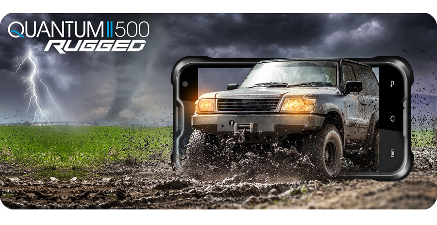 Smartfon wyróżnia się ciekawym wyglądem i mocną obudową w czarnym kolorze. Pomimo solidnej konstrukcji QUANTUM 2 500 RUGGED nie jest ciężki, ani zbyt gruby.