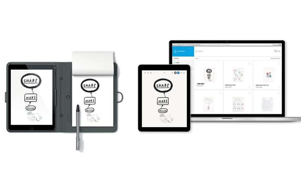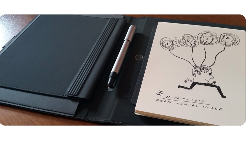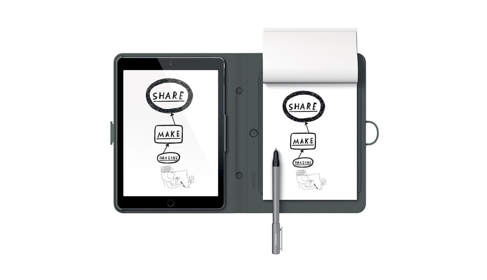 Cyfrowy notatnik i szkicownik posiadający elastyczna kieszonkę na tablet do 9,7", który konwertuje ręczne notatki na wersję cyfrową. Urządzenie umożliwia pisanie, szkicowanie i rysowanie za pomocą piórka Bamboo Spark na papierowych kartkach w formacie A5. Piórko zawiera tradycyjny wkład atramentowy.
