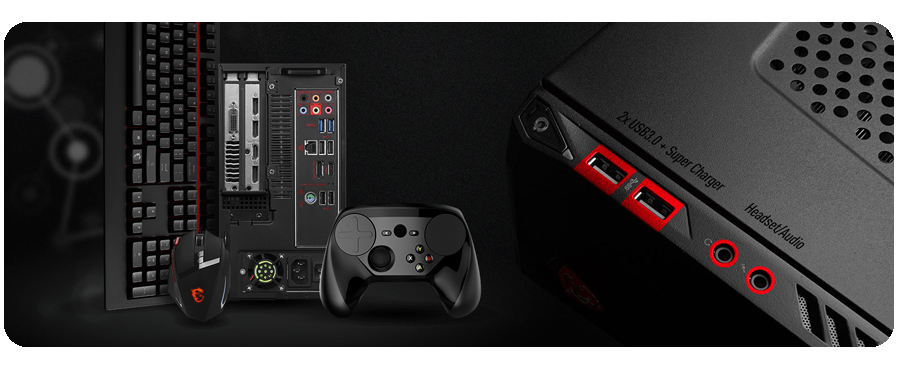 Dzięki portom na obudowie komputera MSI Nightblade możesz podłączyć wszystkie swoje akcesoria i urządzenia do gier.