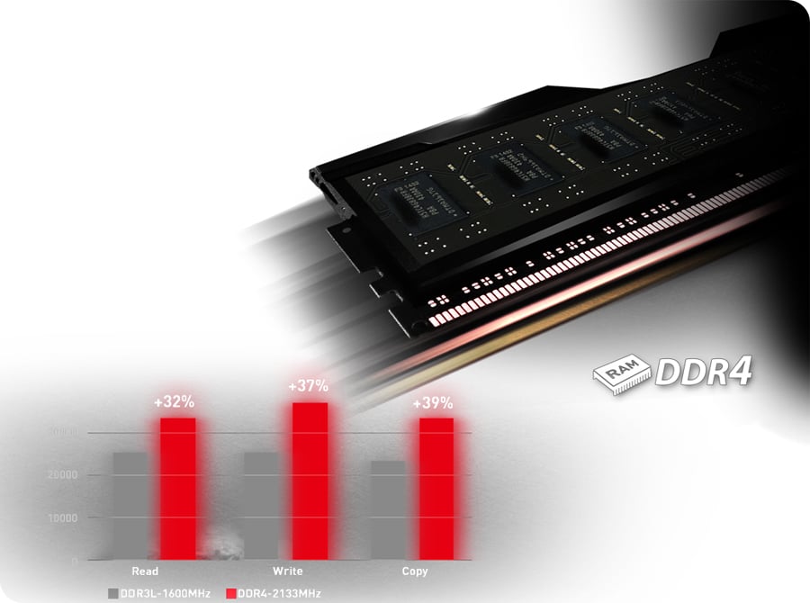 Procesor Core i5 szóstej generacji w zupełnie nowej architekturze, obsługując dużą szybkość DDR4 w modułach pamięci 2133MHz. Podwójny kanał DDR4-2133 zapewnia o 33% większą wydajność w porównaniu z wydajnością dwukanałowej pamięci DDR3-1600.