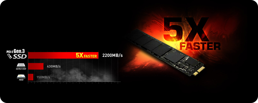 Wejdź do gry przed kimkolwiek dzięki najnowszej przepustowości PCI-E Gen 3.0x4 wykorzystującej technologię NVMe na jednym dysku SSD M.2. Wykorzystaj pełen potencjał dysku Gen 3.0 SSD dzięki optymalizacji sprzętu i oprogramowania, zapewniającej ekstremalną prędkość odczytu wynoszącą nawet 2200 Mb/s, 5 razy szybciej niż dyski SSD SATA3*.