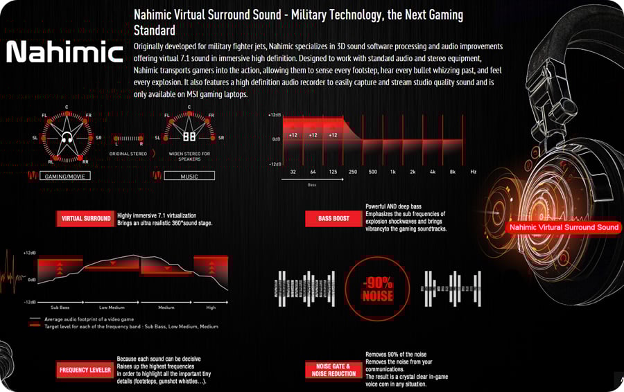 Technologia Nahimic początkowo rozwijana była dla odrzutowców wojskowych i specjalizuje się w dźwięku 3D. Wspiera dźwięk przestrzenny 7.1. Dzięki temu Nahimic przenosi graczy w samo centrum akcji, pozwalając wychwycić każdy krok, usłyszeć każdy przelatujący pocisk i poczuć każdą eksplozję. Nahimic podkreśla nawet najdelikatniejsze dźwięki, potęguje rozgrywkę poprzez wzmocnienie basów i redukcję hałasów z zewnątrz, dla optymalnej wyrazistości głosu oraz zrozumienia dialogów w grze. Ponadto Nahimic wyposażony jest również w nagrywarkę High Definition Audio, byś mógł łatwo rejestrować i przesyłać dźwięk w jakości studyjnej.