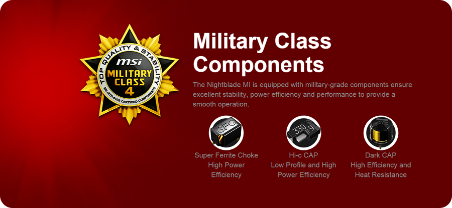 Nightblade MI jest wyposażony w podzespoły klasy militarnej, które oferują doskonałą stabilność, energooszczędność i wydajność, aby zapewnić płynne działanie. Dławik super-ferrytowy zapewnia wysoką sprawność energetyczną, wysokoprzewodzący kondensator polimerowy gwarantuje niski pobór mocy i wysoką sprawność energetyczną a wykorzystanie kondensatora CAP daje gwarancję wydajności i odporności na temperaturę.