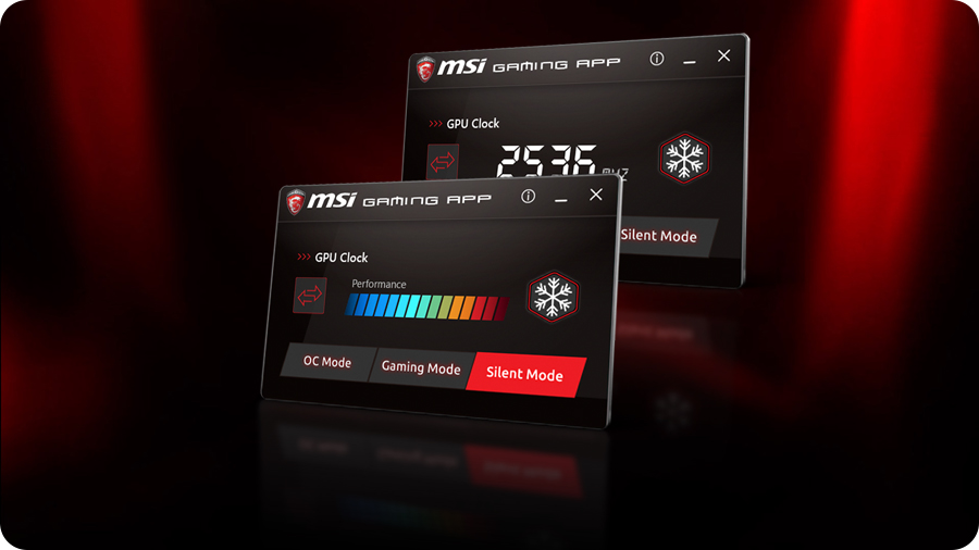 Przewyższaj konkurentów dzięki aplikacji MSI® GAMING APP, która umożliwia jednoczesne sterowanie podkręcaniem zarówno płyty głównej, jak i karty graficznej. Wystarczy wybrać preferowany tryb poprzez kliknięcie przycisku: Silent, Gaming, OC. Pozwala to dopasować system odpowiednio do frajdy bez jakiejkolwiek wiedzy technicznej na temat overclockingu*.