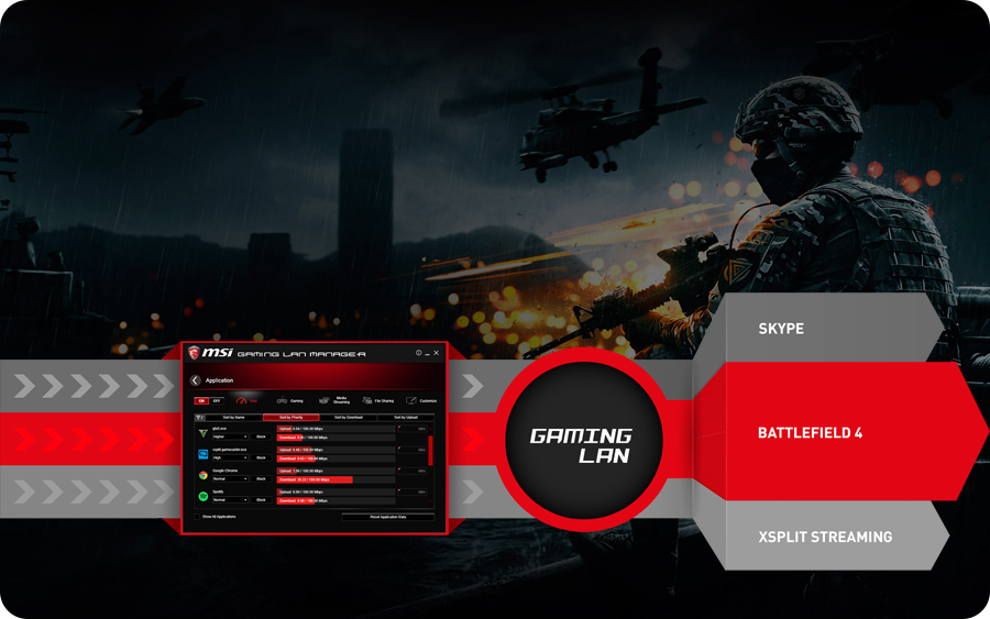 Stworzony z myślą o wysokiej jakości grach online dzięki optymalizacji ruchu sieciowego i niskiej latencji, MSI GAMING LAN MANAGER z funkcją Advanced Stream Detect™ automatycznie klasyfikuje i optymalizuje kolejność aplikacji wrażliwych na opóźnienia dla gier online. MSI Gaming Lan Manager automatycznie ustala priorytety gier nad innymi aplikacjami, umożliwia zmianę priorytetu ruchu sieciowego aplikacji oraz pozwala dostosować przepustowość każdej aplikacji.