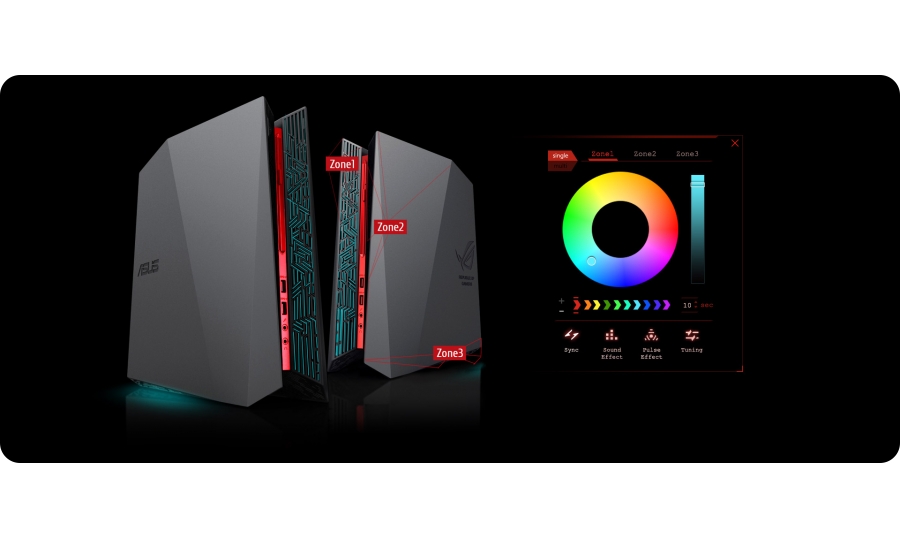 ROG G20 ma bardzo odważny wygląd, z matowoczarnym wykończeniem, agresywnymi liniami i znakami inspirowanych kulturą Majów. Regulowane efekty świetlne mogą pokazać do 8 mln kolorów w różnych miejscach obudowy, odzwierciedlając rodzaj gry, w którą grasz i wnosząc Twoje doznania na zupełnie nowy poziom.