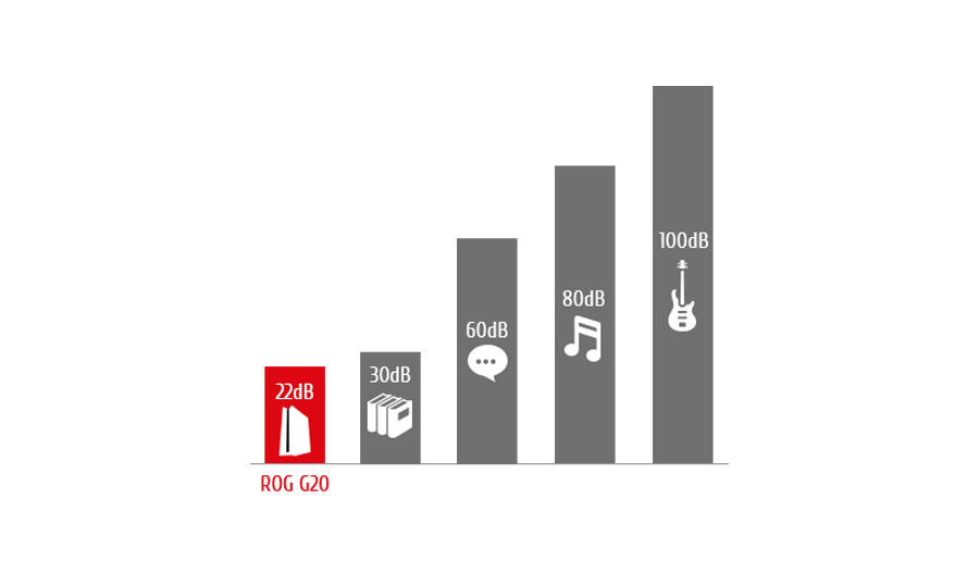 G20 ma konstrukcję bez widocznych z zewnątrz otworów wentylacyjnych. W G20 zastosowano układ chłodzenia wykorzystujący naturalną konwekcję, w tym ukryty kanał powietrzny gwarantujący skuteczne odprowadzanie ciepła podczas maratońskich sesji grania. Co więcej, komputer pracuje w ciszy - jego głośność to zaledwie 22 dB podczas bezczynności.