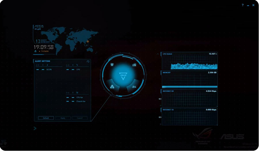 Aplikacja Aegis dostępna wyłącznie w ASUS-ie pozwala na monitorowanie wydajności Twojego komputera ROG G20 w interfejsie przyjaznym użytkownikowi. Aegis umożliwia obserwowanie użycia CPU i pamięci, a także stanu pobierania i wysyłania danych w Internecie. Możesz nawet ustawić przedziały temperatury i napięcia, a system automatycznie będzie się do nich stosował. Aegis oferuje intuicyjne zarządzanie systemem, w którym to Ty zawsze masz pełnię władzy.