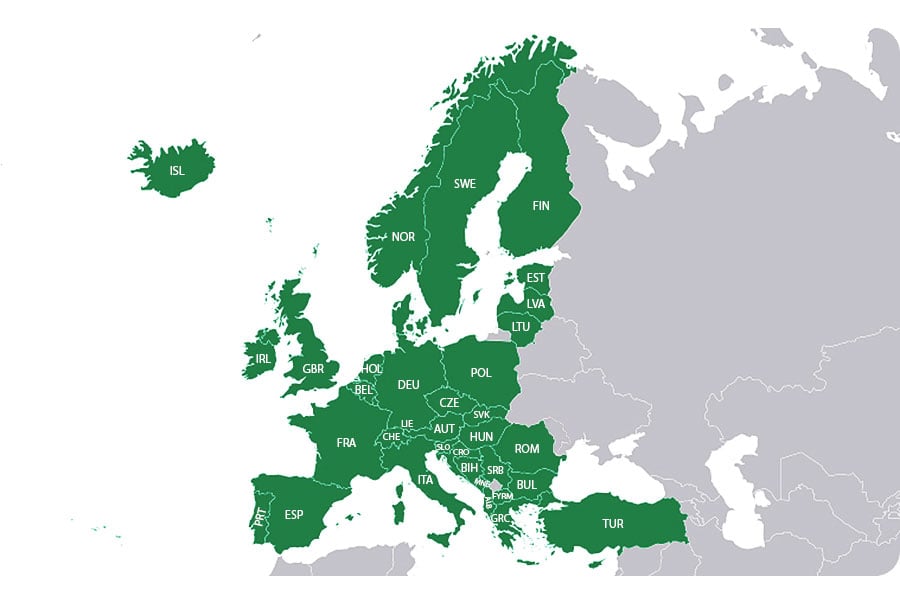 Albania, Andora, Austria, Belgia, Bośnia i Hercegowina, Bułgaria, Chorwacja, Cypr (brak sieci dróg), Czarnogóra, Czechy, Dania, Estonia, Finlandia, Francja, Gibraltar, Grecja, Hiszpania, Holandia, Irlandia, Liechtenstein, Litwa, Luxemburg, Łotwa, Macedonia, Malta, Monako, Niemcy, Norwegia, Polska, Portugalia, Rumunia, San Marino, Serbia, Słowacja, Słowenia, Szwajcaria, Szwecja, Turcja, Watykan, Węgry, Wielka Brytania, Włochy, Wyspy Normandzkie, Wyspa Man.