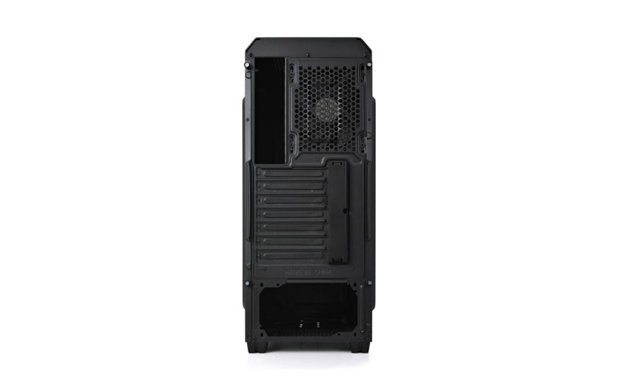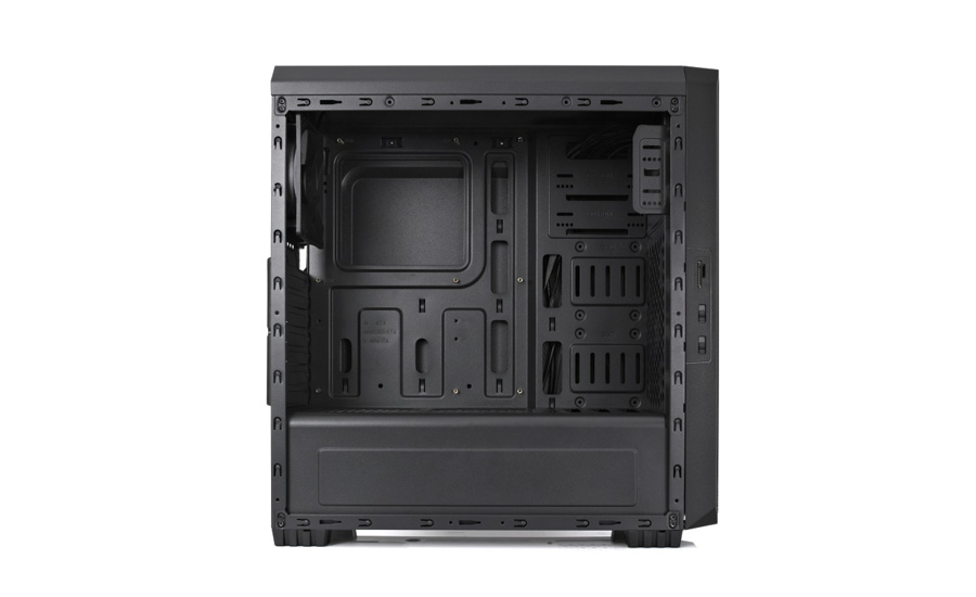 Na panelu przednim znajduje się duży włącznik/wyłącznik zasilania, mały przycisk reset, dwa złącza USB 3.0, kolejne dwa w standardzie USB 2.0, czytnik kart SD XC, kontrolery obrotów wentylatorów oraz gniazda mikrofonu i słuchawek. Na napędy zewnętrzne przeznaczono dwie zatoki 5,25″. Wewnątrz jest miejsce na dwa napędy 2,5″ i na dwa urządzenia 3,5″.