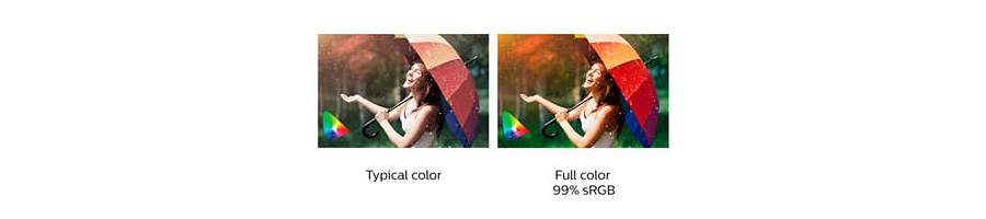 Poznaj żywe oraz bardziej szczegółowe i naturalne kolory. Dzięki standardowi kolorów sRGB, obejmującemu ponad 99% spektrum, możesz mieć pewność, że kolory, które widzisz na ekranie, są dokładnie odwzorowane, bardziej szczegółowe i naturalne.