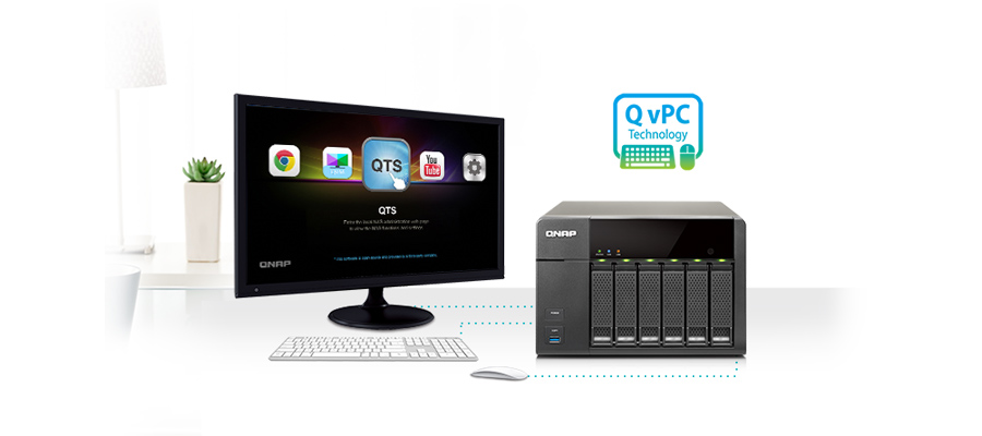Unikalna technologia QvPC firmy QNAP scala szereg wiodących technologii, w tym integrację VM, transkodowanie multimediów, wyjście HDMI, integrację w chmurze oraz technologie połączeniowe NAS, co pozwala użytkownikom – po podłączeniu klawiatury, myszy i ekranu – używać modelu TS-851 jako komputera osobistego. Dzięki technologii QvPC, TS-851 zmienia się w tanie urządzenie o funkcjach komputera osobistego, pozwalające użytkownikom na bezpośredni dostęp do przechowywanych danych, uruchamianie różnych aplikacji na maszynach wirtualnych bazujących na systemach Windows/Linux/UNIX/Android, przeglądanie Internetu w przeglądarce Google Chrome, oglądanie materiałów wideo w rozdzielczości Full HD z audio do 7.1 kanałów w odtwarzaczu Kodi, monitoring w czasie rzeczywistym z wyświetlaniem lokalnym za pomocą systemu Surveillance Station i wiele innych.