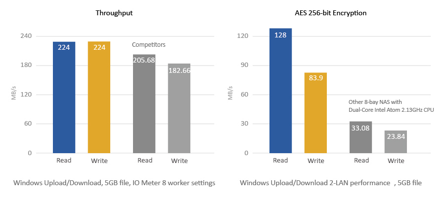Bazując na nowym 64-bitowym, dwurdzeniowym procesorze Intel® Celeron® 2,41 GHz wykonanym w technologii 22 nm z 4 GB energooszczędnej pamięci DDR3L RAM (z możliwością rozbudowy do 8 GB) oraz dzięki 2 portom LAN i złączu HDMI, model TS-851 jest wydajnym domowym serwerem NAS o doskonałym stosunku wartości do ceny i świetnej wydajności: prędkość odczytu i zapisu wynosi do 220 MB/s. W razie potrzeby, podczas wykonywania zadań silnie obciążających procesor, TS-851 potrafi też automatycznie zwiększać taktowanie zegara z 2,41 GHz do 2,58 GHz. Oferowana przez TS-851 funkcja szybkiego szyfrowania i deszyfrowania umożliwia transfer na poziomie do 68 MB/s; rozwiązanie pozwala na szyfrowanie wolumenu 256-bitowym szyfrem AES, co podnosi wydajność systemu przy jednoczesnym zagwarantowaniu bezpieczeństwa poufnych danych przechowywanych na TS-851. W przypadku instalacji z dwupasmową kartą sieciową Wi-Fi 2,4 GHz / 5 GHz 802.11ac, TS-851 jest w stanie oferować niezwykle wysokie prędkości przesyłania dużych plików oraz strumieniowania multimediów wymagających dużej szerokości pasma.