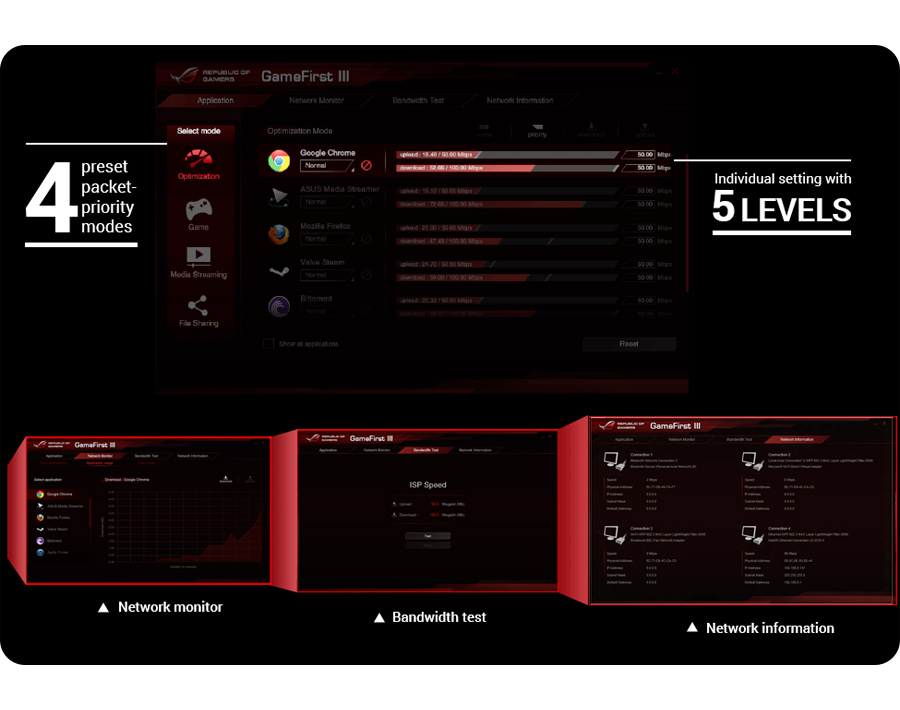 Na wygranej lub ostatecznej porażce mogą zaważyć jedynie milisekundy, dlatego też autorska technologia GameFirst III pomaga w nadaniu najwyższego priorytetu pakietom związanym z grą i przydziela rozgrywkom większe pasmo, tym samym eliminując lagi, opóźnienia w strumieniowaniu i dzieleniu się plikami – zawsze będziesz faworytem.