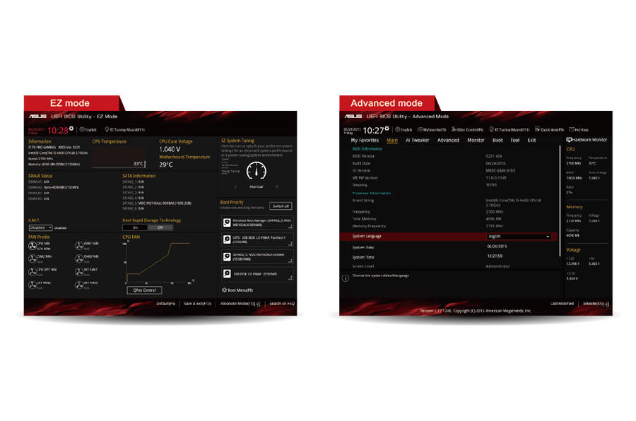 Najwygodniejszy, najładniejszy BIOS graficzny sterowany myszą został ulepszony po to, by jeszcze bardziej zachwycać. Bez względu na to, czy jesteś nowicjuszem w PC, czy doświadczonym overclockerem, tryby EZ i Advanced pomagają w odnalezieniu właściwej drogi. W EZ Mode możesz bardzo szybko skonfigurować system, ustalić datę i godzinę, włączyć profile wentylatorów i profile pamięci Intel Extreme Memory Profile (XMP). Po przejściu do trybu Advanced Mode ustawisz ulubione elementy i skróty, zapiszesz i sprawdzisz ostatnie zmiany dzięki funkcji Last Modified albo sporządzisz notatki w Quick Notes.