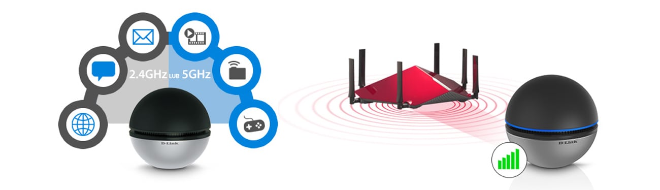 Przeglądaj strony internetowe i czatuj online w paśmie 2,4 GHz, a jednocześnie wykorzystuj bardzo szybkie pasmo 5 GHz do strumieniowej transmisji multimediów, grania online i przesyłania dużych plików. Poprawia zasięg, przydzielając przepustowość Twoim urządzeniom, gdy przenosisz je w różne miejsca w domu. Możesz strumieniowo przesyłać filmy w jakości HD, przeglądać strony internetowe, rozmawiać na Skype ze znajomymi oraz grać w gry online z każdego miejsca — zawsze z pełnym zasięgiem sieci.